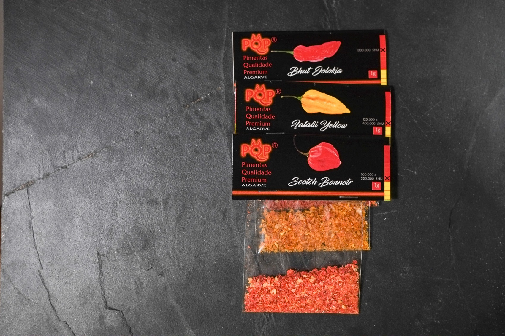 1g de Bhut Jolokia (855,000 – 1,041,427 SHU), 1g de Scotch Bonnet (100.000 a 350.000 SHU) e 1 g de Fatalii amarela (300 000 SHU).