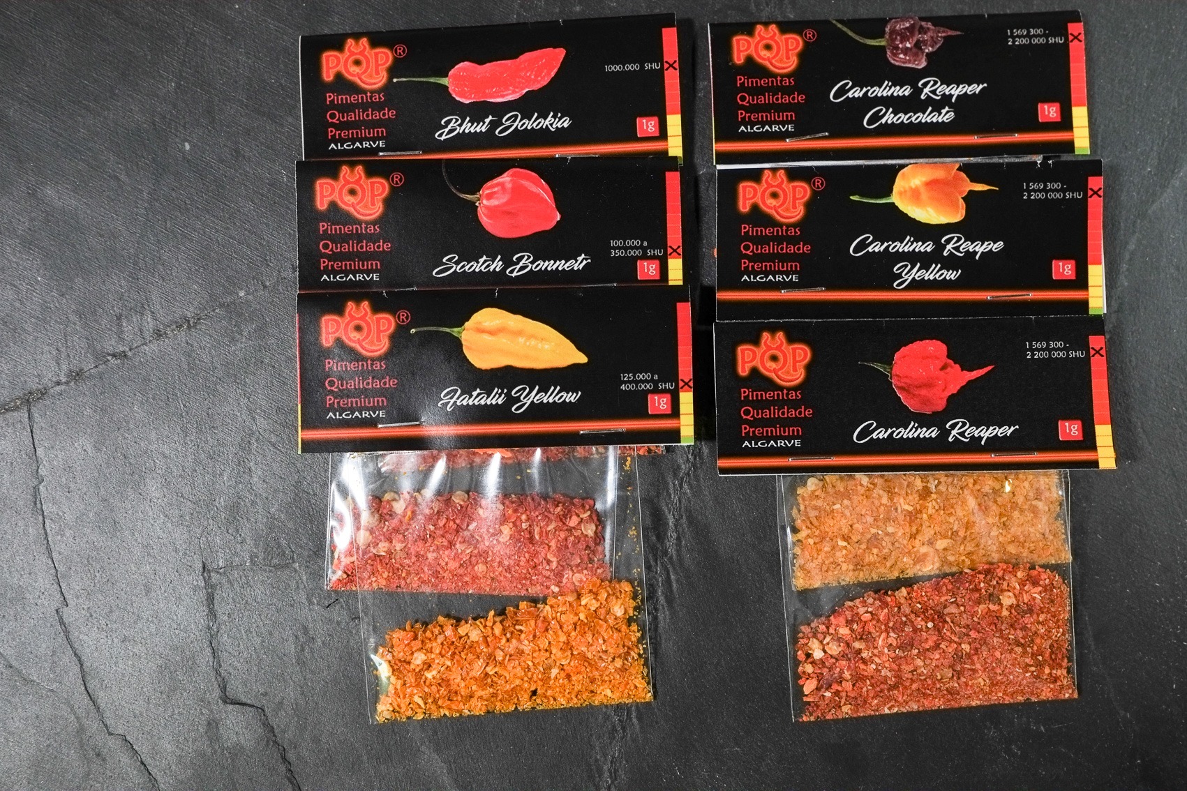 1g de Bhut Jolokia (855,000 – 1,041,427 SHU), 1g de Scotch Bonnet (100.000 a 350.000 SHU) e 1 g de Fatalii amarela (300 000 SHU) 1g Carolina Reaper Amarela, 1g de Carolina Reaper Chocolate, 1g de Carolina Reaper vermelha (1,150,000 a 2,200,000 SHU).